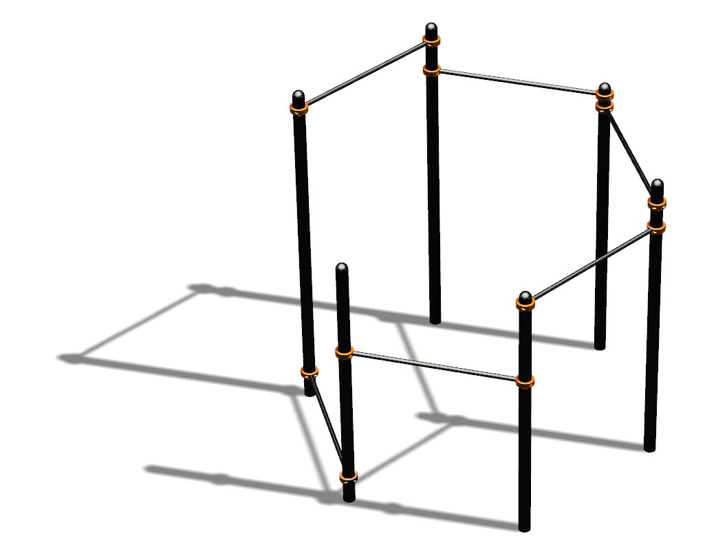 Конструкция для выполнения различных упражнений из комплекса воркаут, а также для проведения базовых тренировок для общего физического развития. Спортивный комплекс состоит из разноуровневых турников и упоров для отжиманий. Все элементы изготовлены из прочного металла, который покрыт защитным слоем от коррозии и порошковой краской. Это сборно-разборный тип конструкции, который после доставки отдельными элементами собирается на объекте с использованием болтов и гаек.